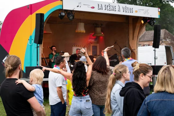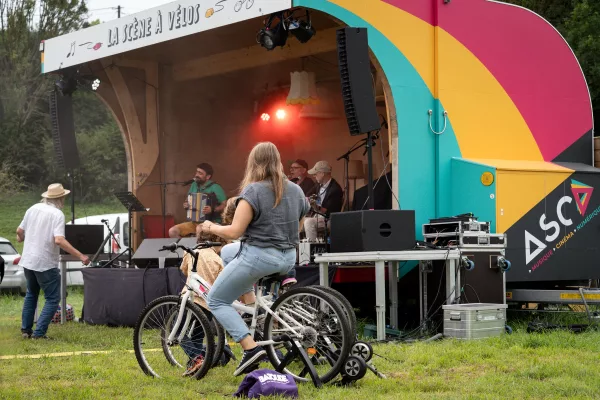 Imaginée pendant le confinement, à une période où l’isolement a renforcé le désir de se rassembler autrement, la Scène à Vélos renouvelle la rencontre artistique. Désormais, c’est la scène qui vient à la rencontre des habitants et qui crée du lien entre spectateurs, communes et associations du territoire.
